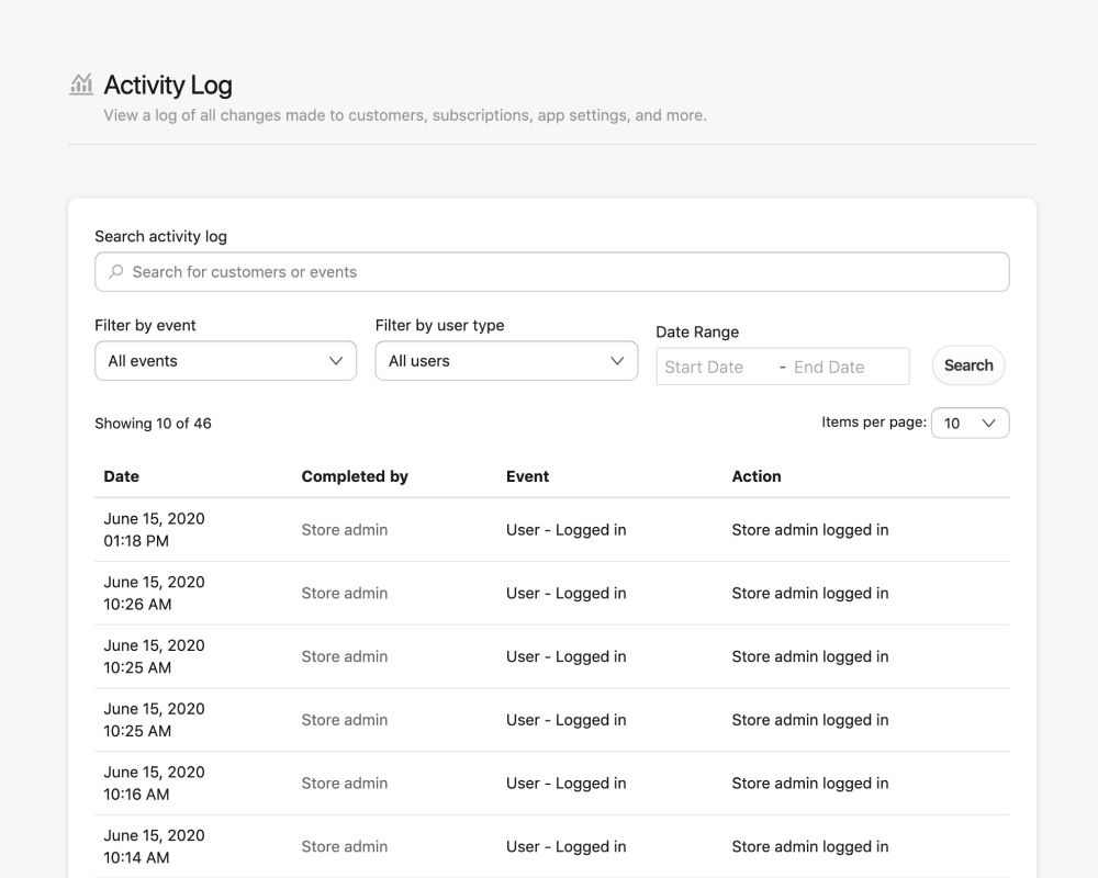 View a complete list of activities in one central location -- including customers, subscriptions, app settings, emails sent, customers logins, and more. Dive deeper to look into specific areas using filters for events, user types, and date ranges.