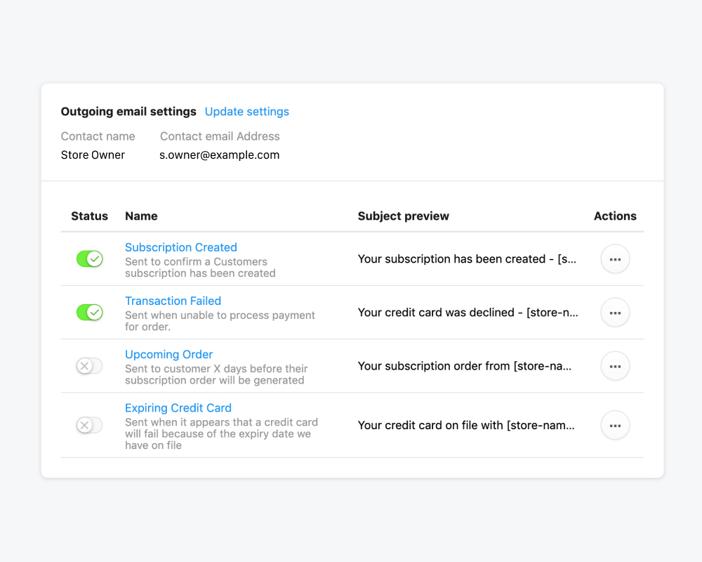 Send custom email notifications that are automatically triggered for a variety of scenarios such as subscriptions renewals, credit card expiration, billing errors and more. Merchants can view and edit notifications themselves in the backend, using the activity log.