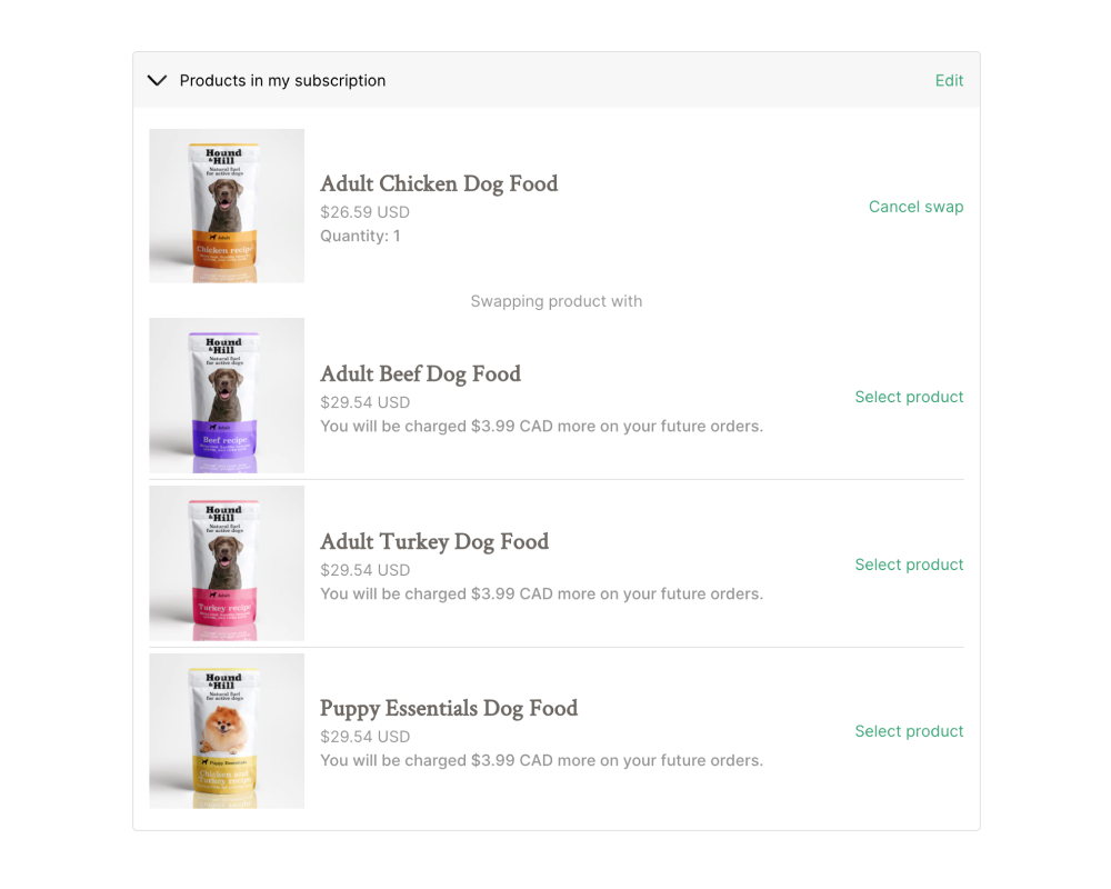 Allow customers to easily swap out one subscription product for another, whether they’re looking for a different color or flavor, or a smaller or bigger size. They can easily edit any variable on their own using the swap product feature.