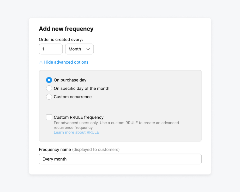 Have full control over the frequencies presented to customers, including advanced scheduling options by date, day or even interval (like the 15th of every month, every second Sunday of the month, or every three months) to ensure their orders fit around their fulfillment or production schedules.