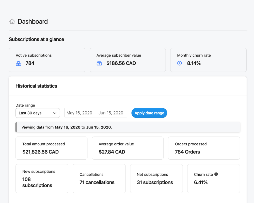 The dashboard provides a snapshot of the store’s subscriptions data, to gain insights on recurring orders and revenue.