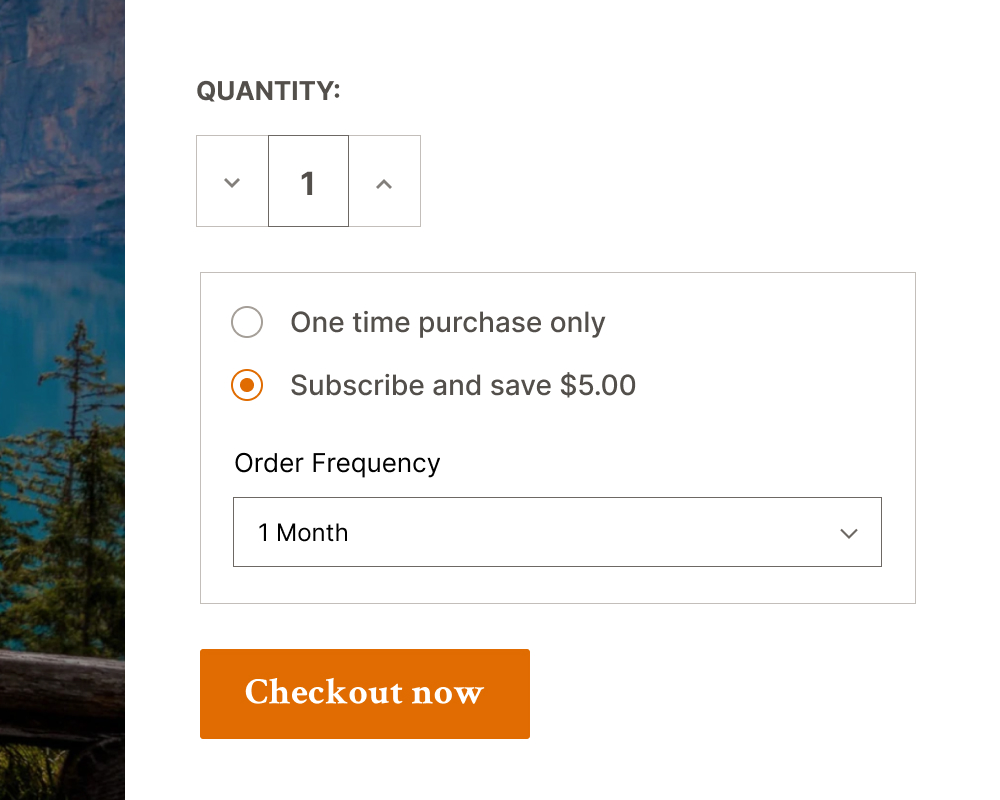 Incentivize subscriptions over one-time products with a subscribe and save deal. Choose between a percentage discount (ex. Subscribe and save 10% off) or a certain dollar amount discount (ex. Subscribe and save $10 off). The choice is yours to make on the back end, and will be reflected on the product page.