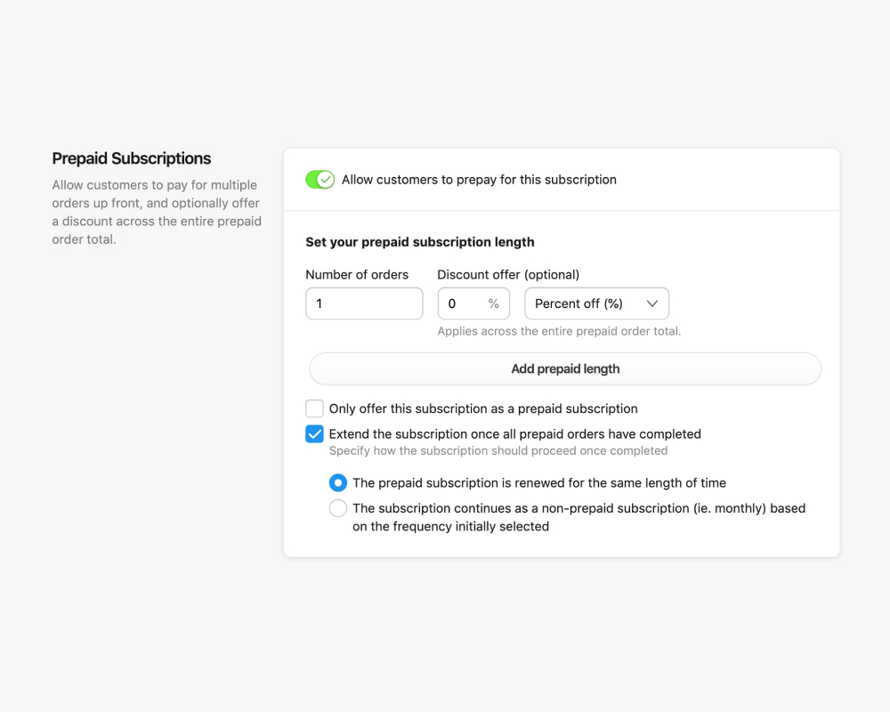 As a flexible payment option, prepaid subscriptions offer customers the option to pay for a certain allotment of shipments ahead of time, often denoted by a length of time the recipient will receive their products ie. 3 months, 6 months, or 1 year.